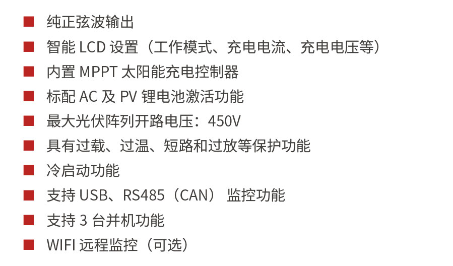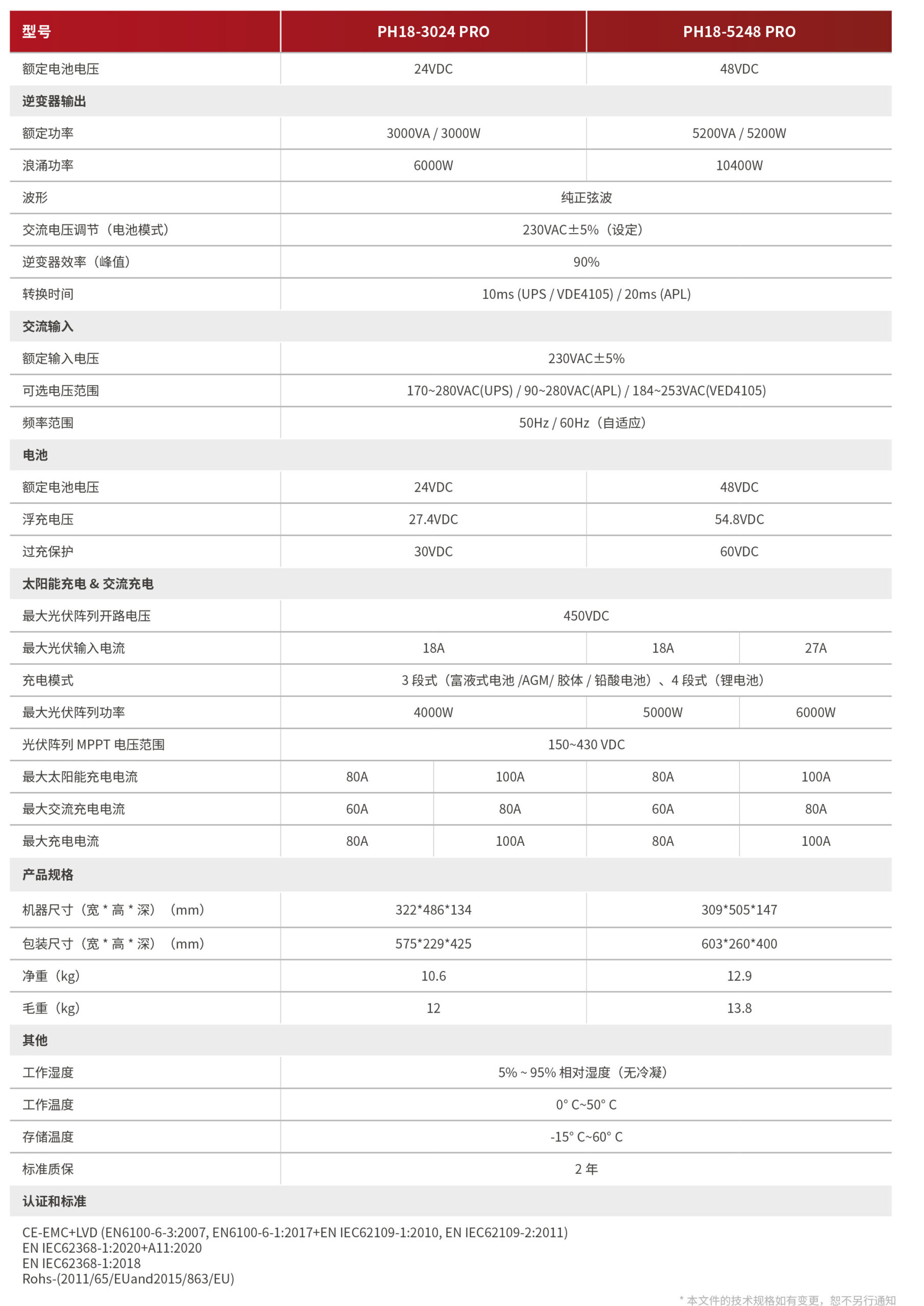 PH1800 PRO 是一款高頻離并網一體的光伏逆變器,內部集成 MPPT 控制器、AC 充電器、逆變器等功能模塊于一體,此系列產品無需電池即可運行。最大光伏陣列開路電壓可達 450V,最大功率點電壓為 150~430V,可幫助用戶充分利用太陽能。