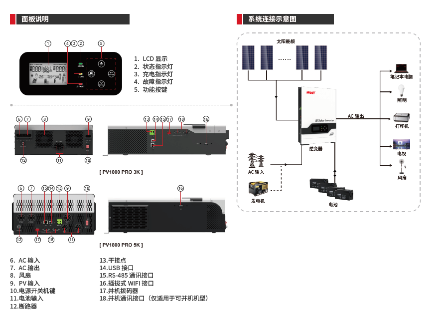 PV1800 PRO 系列是一款純正弦波高頻太陽能逆變控制一體機、具有較寬的 PV 輸入范圍,當能量足夠時可不接電池帶載、具有功率密度高、體積小、操作簡單、整機效率高、空載損耗小等優點。廣泛應用于戶用型系統、通訊基站、監控系統、牧區、5G 輔助供電等。