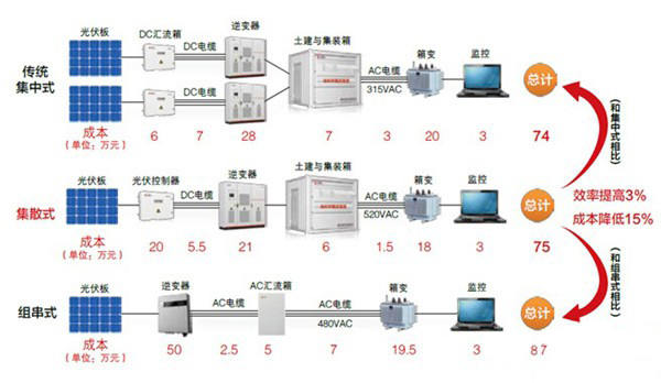 組串式逆變器方案中,將逆變器和匯流箱的全部功能都轉移至“匯流箱”,將“傳統匯流箱”大幅升級為“組串式逆變器”;
