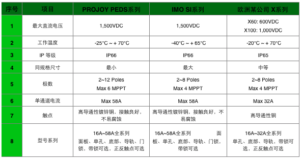 更高的系統電壓除了對直流開關電壓電流作出新的要求,同時也對開關的工作溫度,IP等級都有了更高要求。普兆PEDS系列開關可在-25℃~+70℃環境溫度下滿載工作,IMO SI系列開關工可在-40°C ~ + 65°C環境下工作。而歐洲某廠家系列開關僅在-20°C ~ + 70°C下工作。同時,防護等級看,普兆PEDS開關可達IP66等級,國內暫時還沒有其他開關廠家能夠做到這樣的防護等級。