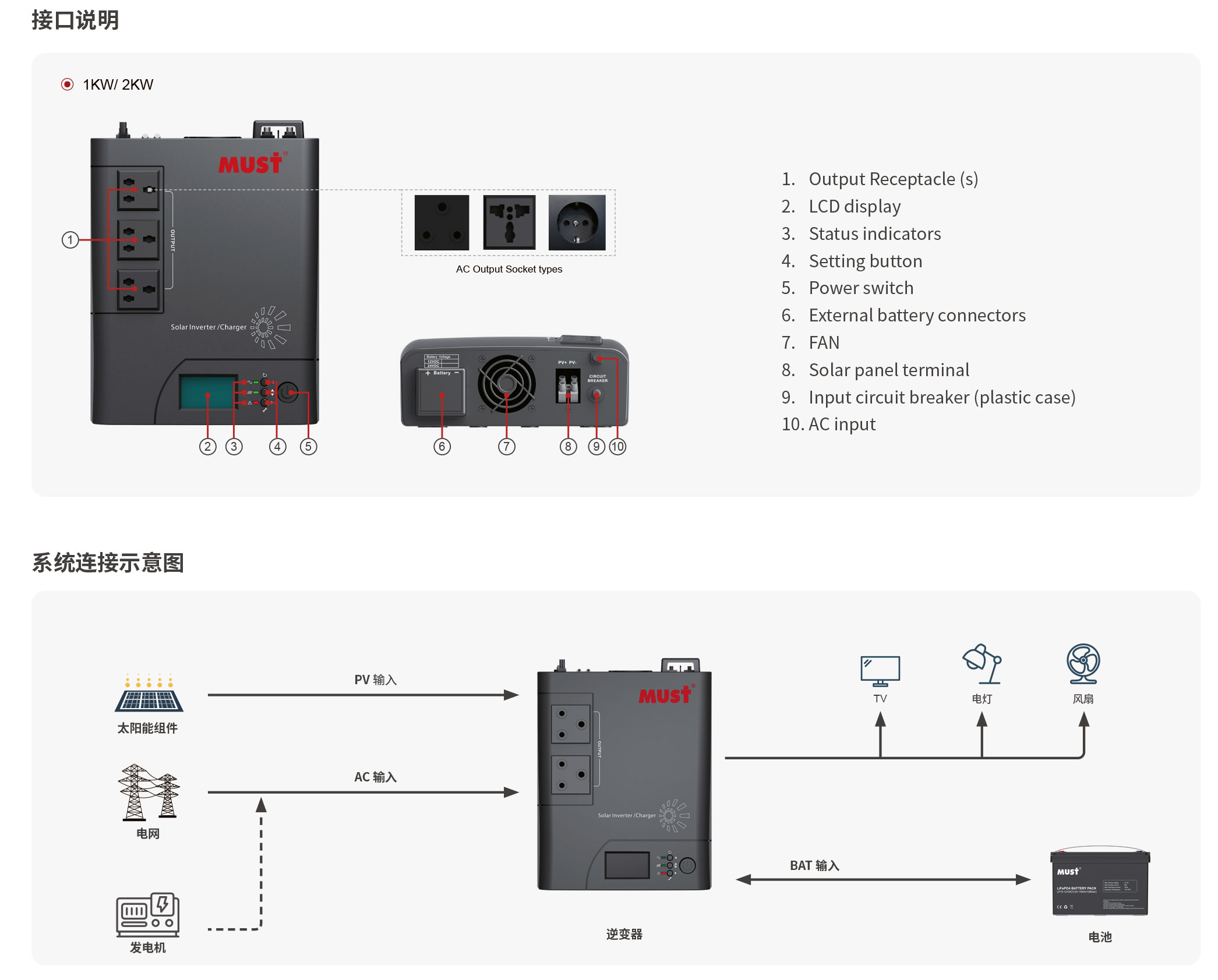 PV1500 是一款高性價比太陽能逆變器,可同時接受太陽能和公用事業輸入。 用戶可通過LCD 屏和簡便按鈕調節,電池充電電流、交流/ 太陽能充電器優先級和直流優先等功能。當電池電壓低時,它會自動切換到交流電網為負載提供持續電力。
