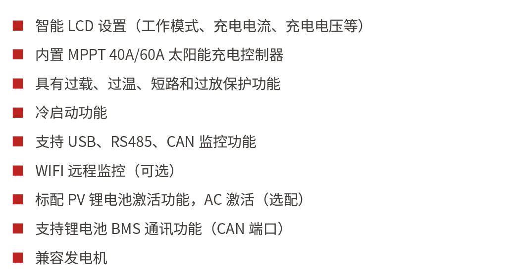 PV1800 VPM II 系列是一款正弦波離網逆變控制一體機、內置 40A/60A 的 MPPT充電控制器,具有市電充電、旁路輸出的功能,為負載提供不間斷電源供應。用戶可通過屏幕設置鍵設置各項參數及各類工作模式。