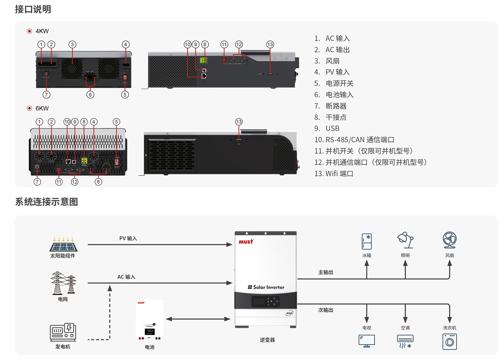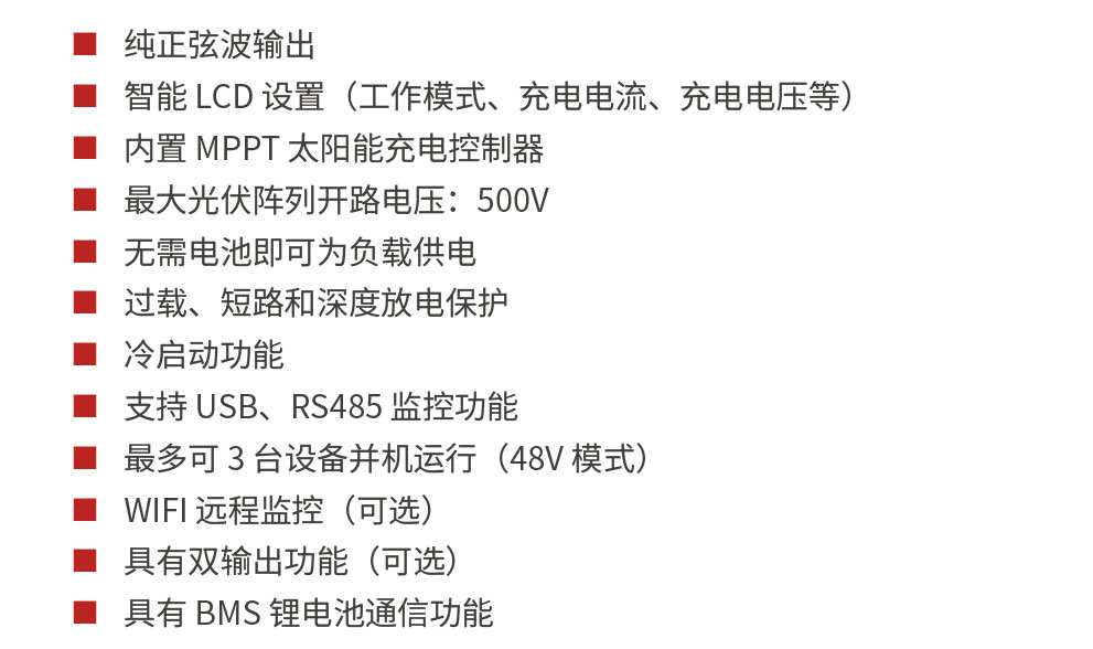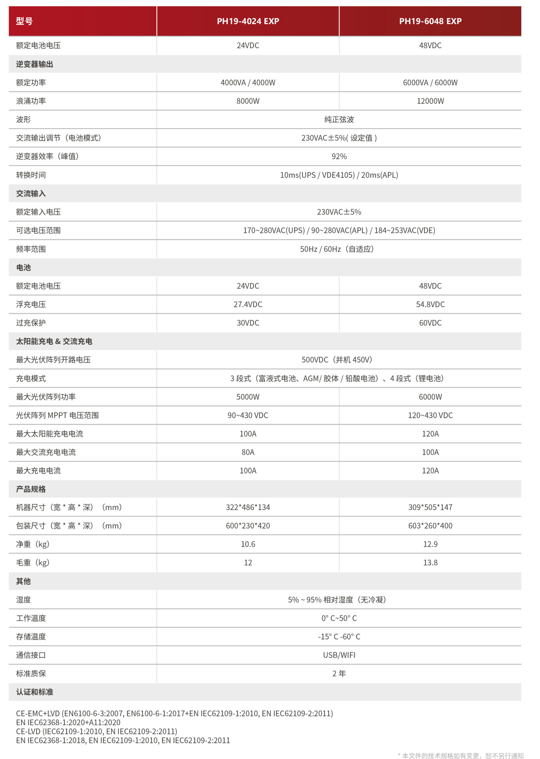 PH1900 EXP 系列離網太陽能逆變器,具有雙交流輸出功能,當電池電壓較低時,逆變器斷開主負載,保證次級負載的輸出,可以延長次級負載的運行時間。