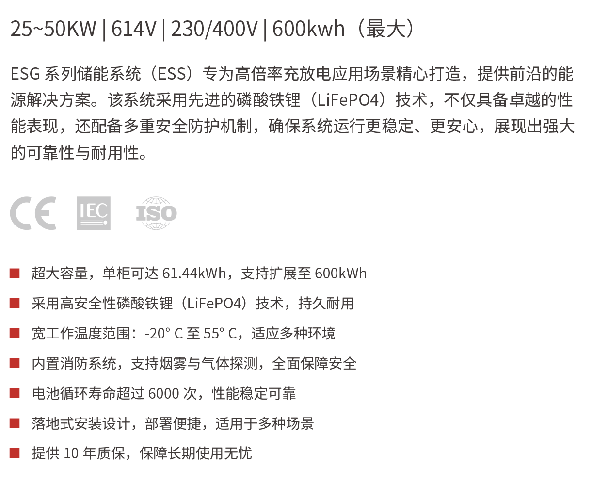 ESG 系列儲能系統(tǒng)(ESS)專為高倍率充放電應(yīng)用場景精心打造,提供前沿的能源解決方案。該系統(tǒng)采用先進的磷酸鐵鋰(LiFePO4)技術(shù),不僅具備卓越的性能表現(xiàn),還配備多重安全防護機制,確保系統(tǒng)運行更穩(wěn)定、更安心,展現(xiàn)出強大的可靠性與耐用性。
