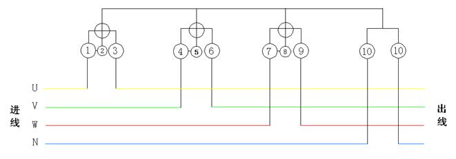 三相四線有功電表的直接接線式:三相四線有功電表由三個驅動部件組成,稱三元件電表,和單相及三相三線電表外觀上最大的不同是其共有11個接線端。在并網之前,我們首先要知道,三相電的顏色:U相(第一相)為黃色,V相(第二相)為綠色,W相(第三相)為紅色。三相電表的1,4,7端子是U,V,W三相進線,3,6,9是U,V,W三相出線,10號端子接零線N。接線示意圖如圖3所示: