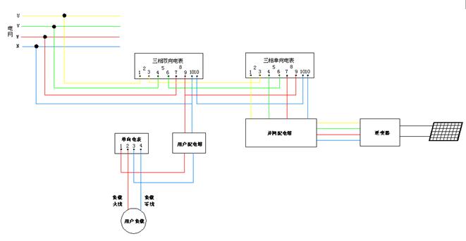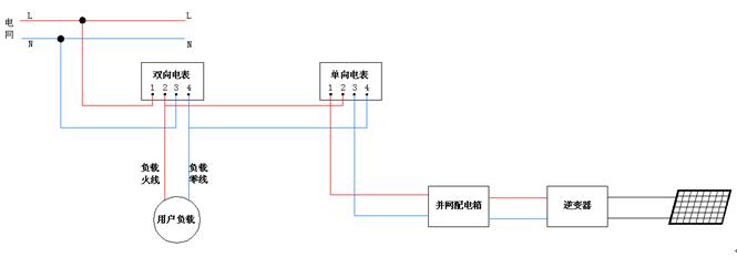 自發自用、余電上網模式下光伏發出的電存在不能全部被用戶消耗的情況,而余下的電能則需要輸給電網,電表需要計量一個數字;在光伏發電不能滿足需求時則需要使用電網的電,這又需要計量另一個數字,普通單塊電表不能達到這一要求,所以要實現自發自用、余電上網,需使用具有雙向電表計量功能的智能電表。接線圖如圖6和圖7所示:
