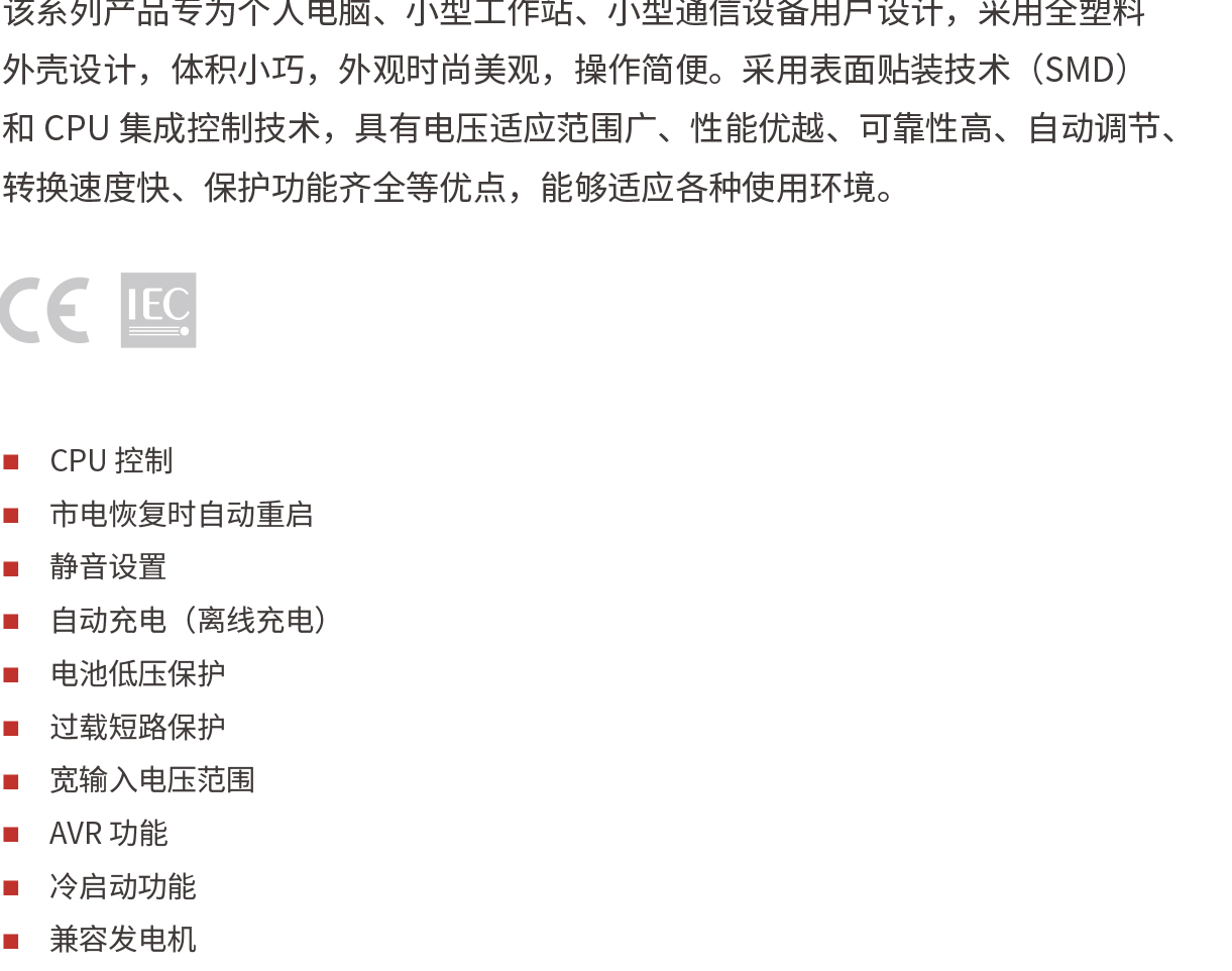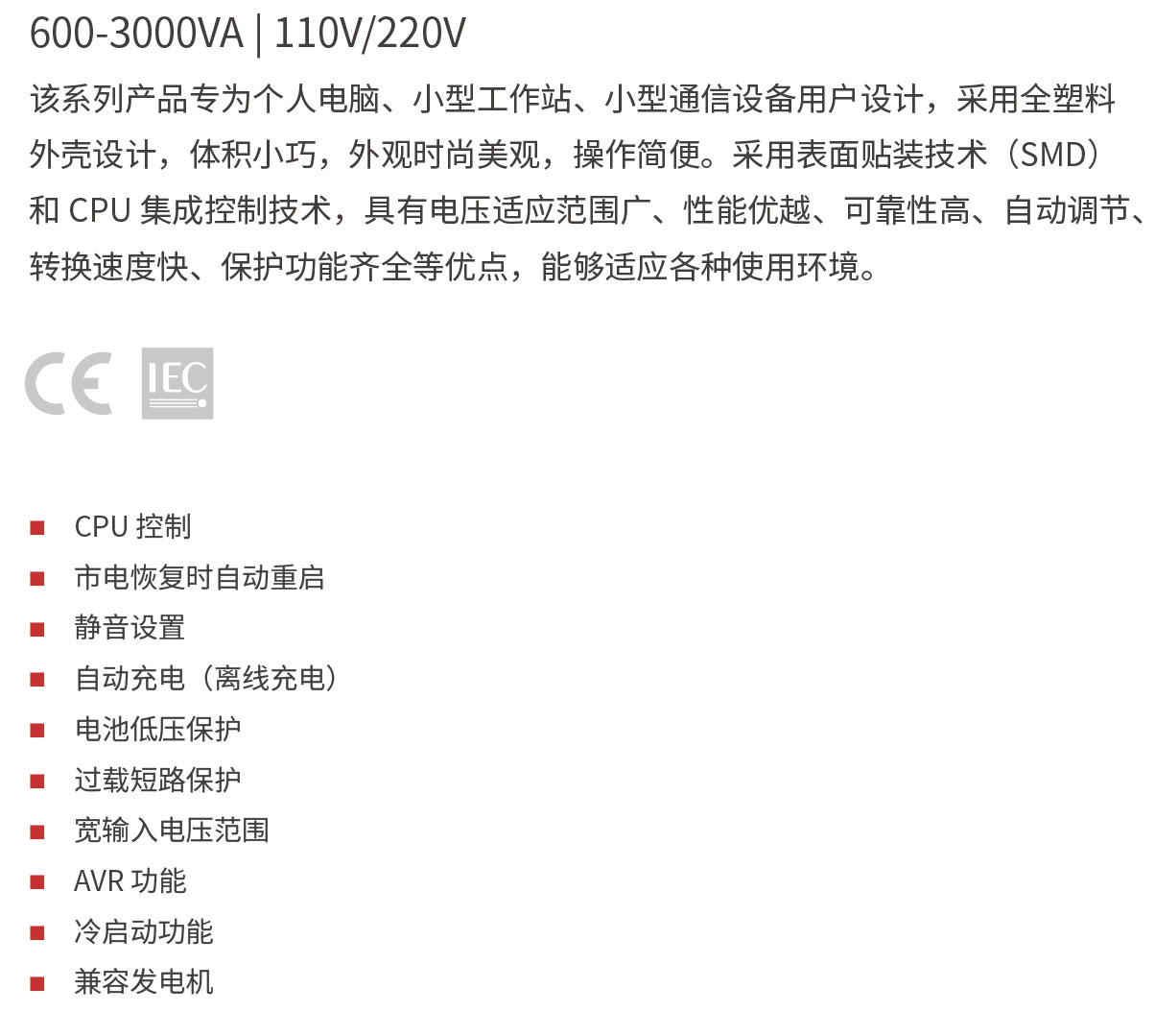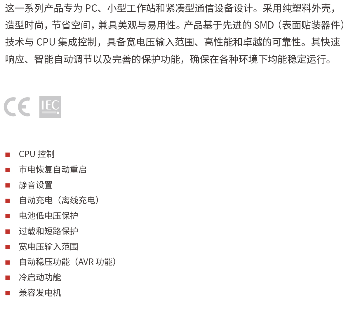 - 具有交流輸入過、欠壓保護,輸出過載保護、短路保護、溫度保護、電池欠壓預警保護和電池過充保護等。