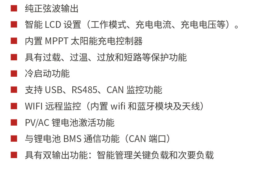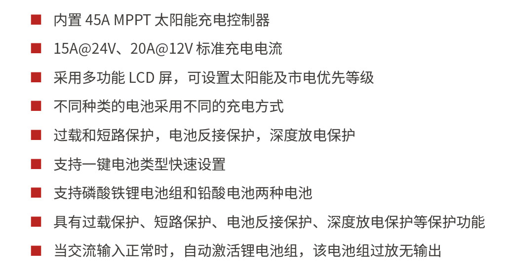- 具有多制式模式,可通過液晶顯示屏設置電池優先模式、市電優先模式、可設置充電電壓及充電電流、電池低壓關機點電壓、市電輸入的寬窄范圍